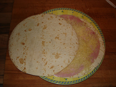 Auf die Tortilla Schinken und Käse legen und eine zweite Tortilla drauflegen. In der Mikrowelle ca. 1 bis 1 1/2 Minuten bei 600 Watt erhitzen, bis der Käse geschmolzen ist. In Hälften oder Viertel schneiden und sofort servieren. Beim Essen öffnet man die Tortilla wieder etwas und gibt Salsa dazwischen, zuklappen und Buen Provecho (Guten Appetit). Man kann auch auf einer Hälfte einer Tortilla Schinken und Käse legen, zuklappen und wie oben verfahren.